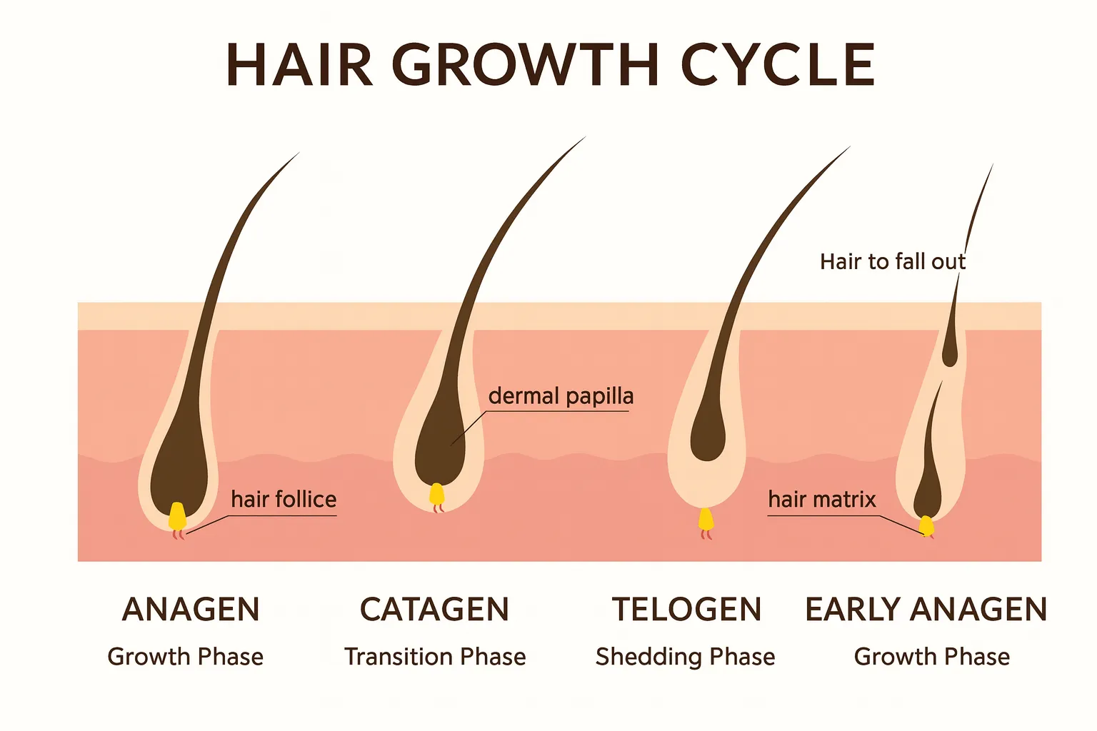 Hair loss in menopause is something many people experience, often without understanding what’s causing it at first. Falling oestrogen and progesterone levels disrupt the natural hair growth cycle, which relies on these hormones to keep follicles healthy and in the growing phase (anagen) for longer. When hormone levels drop, the growing phase shortens, and more hair moves into resting (telogen) and shedding phases.